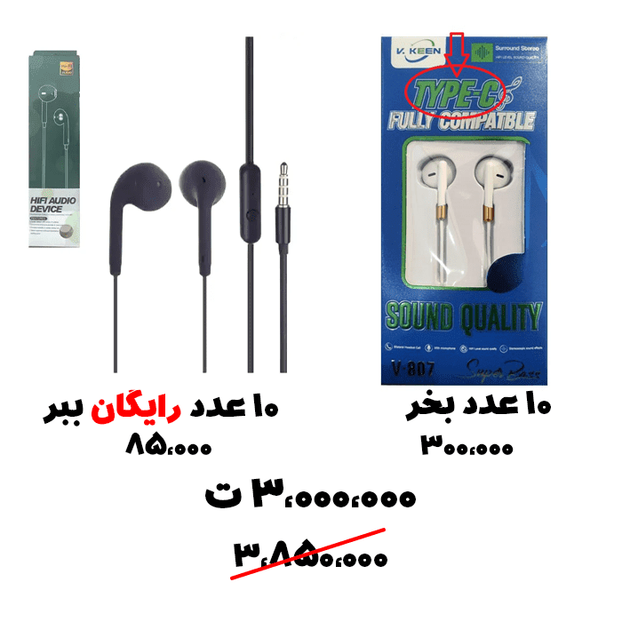 | 10 عدد هندزفری تایپ سی بخر | برندV.Keen (هر عدد 280 هزار تومان) |